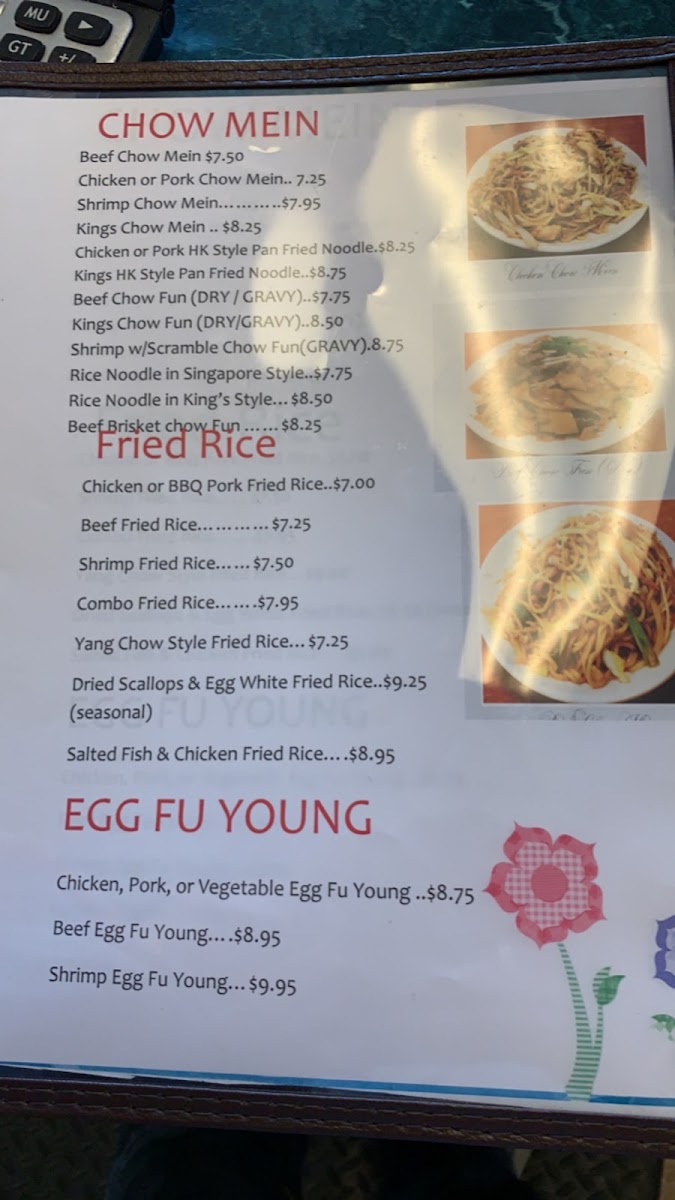 The menu at King's Express Chinese Restaurant features a variety of traditional Chinese dishes organized into several categories to accommodate different meal preferences. Offerings include noodle and rice dishes such as Chow Mein and King's Rice Noodle, alongside a selection of meat and seafood entrees like Sweet and Sour Pork, Peking Style Pork Chop, Cashew Nut Shrimp, and Beef Chow Fun in Black Bean Sauce. There are also appetizer options including Crab Rangoon and Egg Rolls.